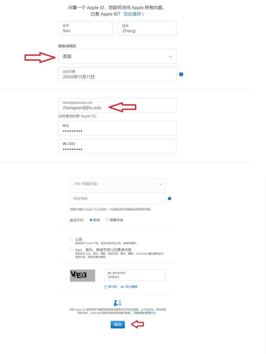 填写注册资料和信息,注意要用英文填写,国家选项一栏,选择“美国”,邮箱建议使用国际邮箱,没有国际邮箱的同学也可以使用JHU的邮箱。
